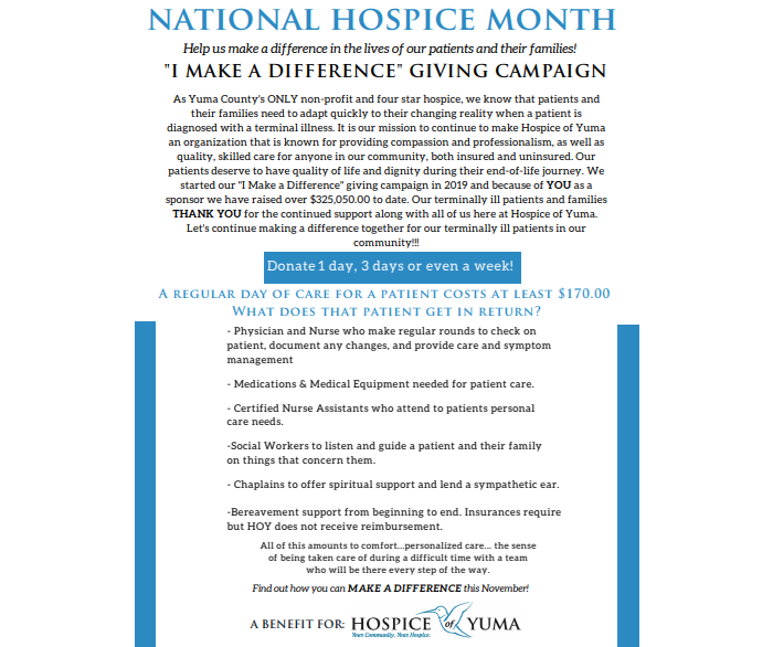 • Acknowledgment in our Spring Issue of Hospice Newsletter & Annual Report