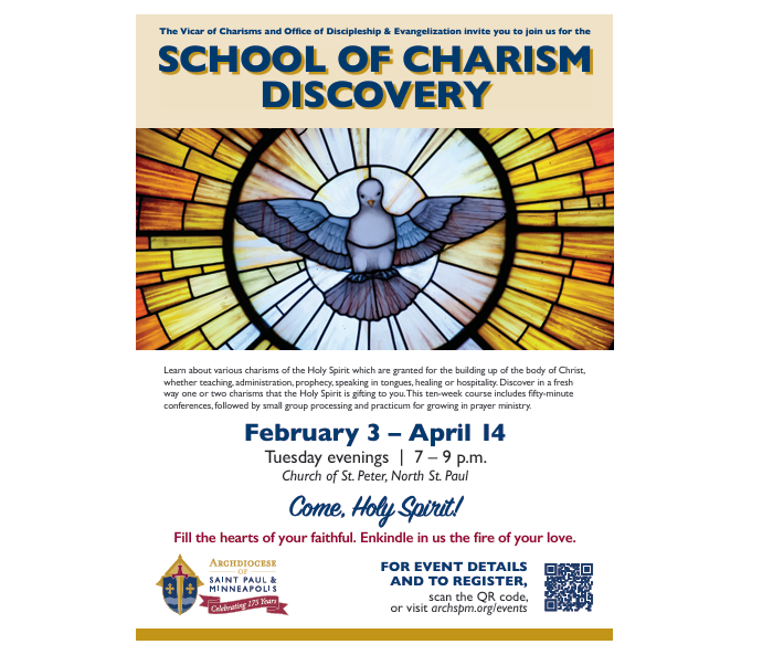 The School of Charism Discovery is a 10-week course which includes lectures and practicum. The goal is to learn about the Holy Spirit's charisms gifted to the Body of Christ and how they are exercised, and for each participant to discover which charism(s) God might be gifting to him or her.
