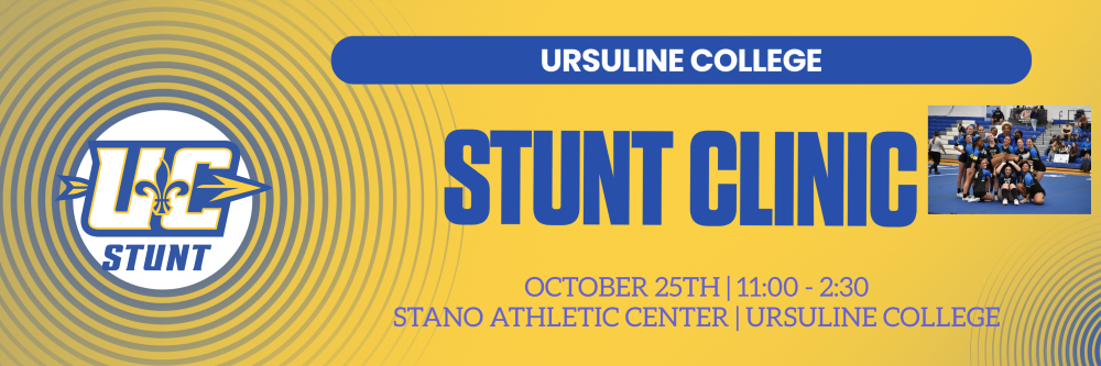 The Ursuline College STUNT team is excited to host a clinic for high school athletes grades 9-12 interested in learning more about the sport of STUNT and/or the technical skills of partner stunts, pyramids & tosses, jumps, and tumbling. The clinic will be held on October 25 at Ursuline College in the gymnasium of the Stano Athletic Center (2550 Lander Road, Pepper Pike, Ohio) from 11:00am to 2:30pm. Registration ends October 1.