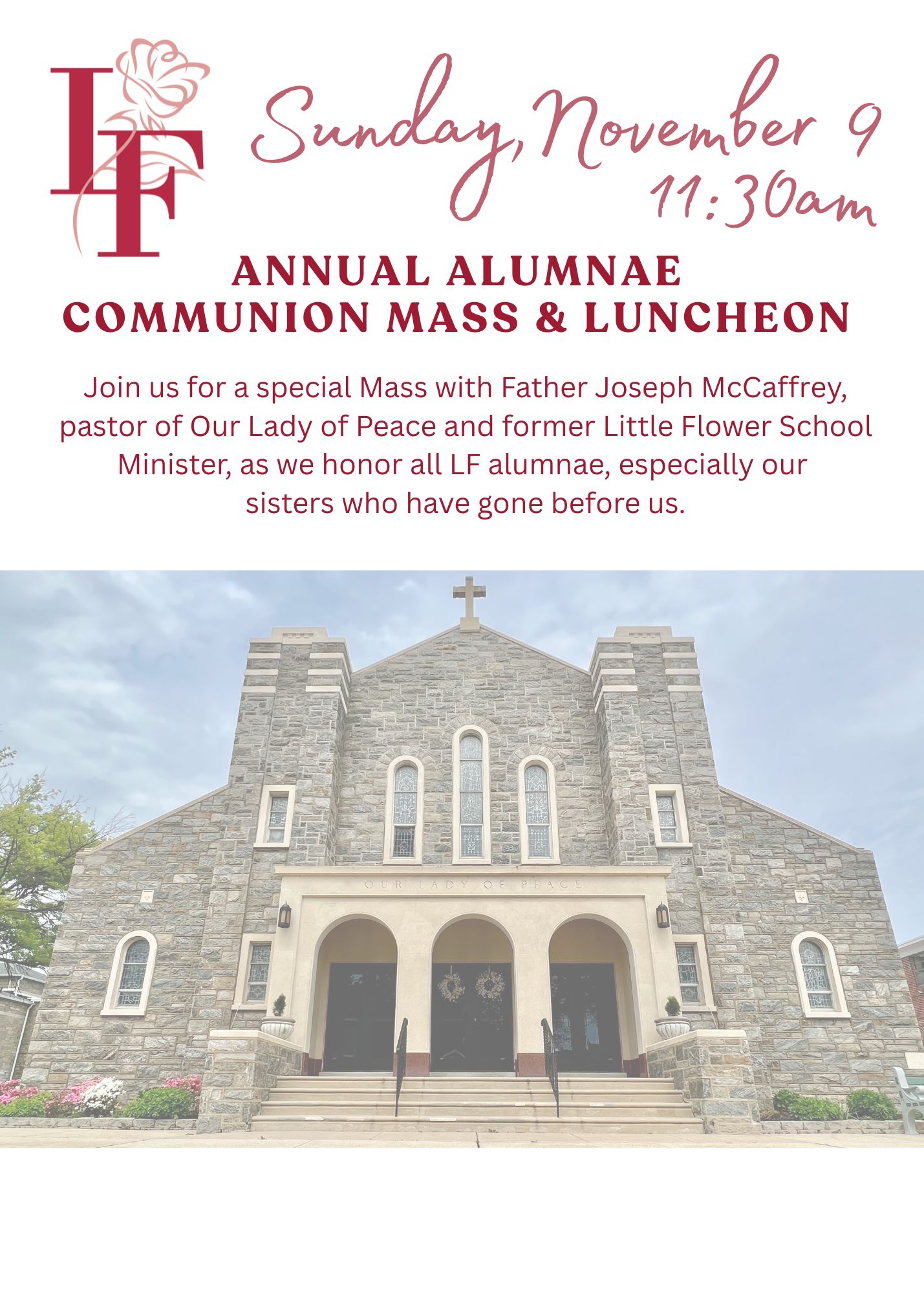 The Annual Alumnae Communion Mass and Luncheon will be held on Sunday, November 9 at 11:30 AM at Our Lady of Peace Church in Milmont Park, PA. The luncheon will follow at 1:00 PM at Nelson Hall at Notre Dame Church in Swarthmore. The celebrant for the Mass will be Father Joseph McCaffrey, pastor of Our Lady of Peace and former Little Flower School Minister. Please join us for this cherished tradition of honoring all Little Flower alumnae, especially our deceased LF sisters.