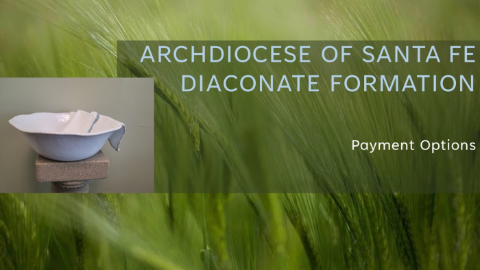 Thank you for choosing to fulfill your commitment to the Archdiocese of Santa Fe - Diaconate Formation by utilizing this payment option, paying by credit card. Before you begin, have your invoice number(s) close at hand, if you do not know this required information, please call Yolanda Sutton at 505.831.8246 or email her at ysutton@archdiosf.org. You will have option to pay your invoice(s) in full or make a payment on your outstanding balance, each transaction will include a 3% card transaction fee.